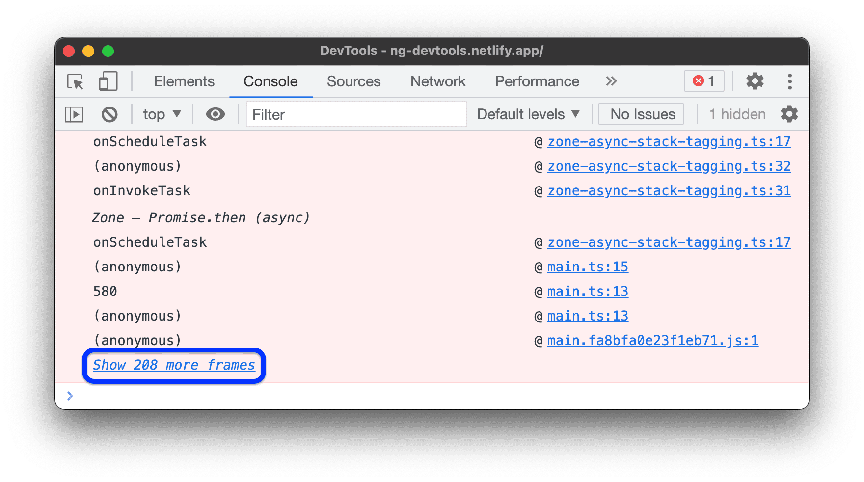 ソースマップに ignoreList フィールドが含まれている場合、デフォルトでは、バンドルツール(webpack など)またはフレームワーク(Angular など)によって生成されたソースのサードパーティ フレームは、Console のスタックトレースから非表示になります。