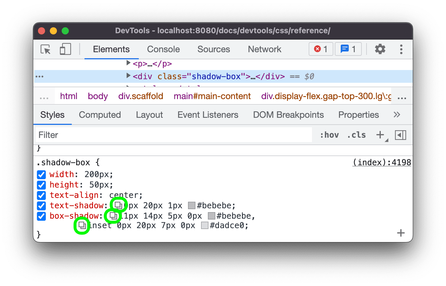 2. स्टाइल टैब में, text-shadow या box-shadow एलान के बगल में मौजूद शैडो शैडो. आइकॉन ढूंढें.